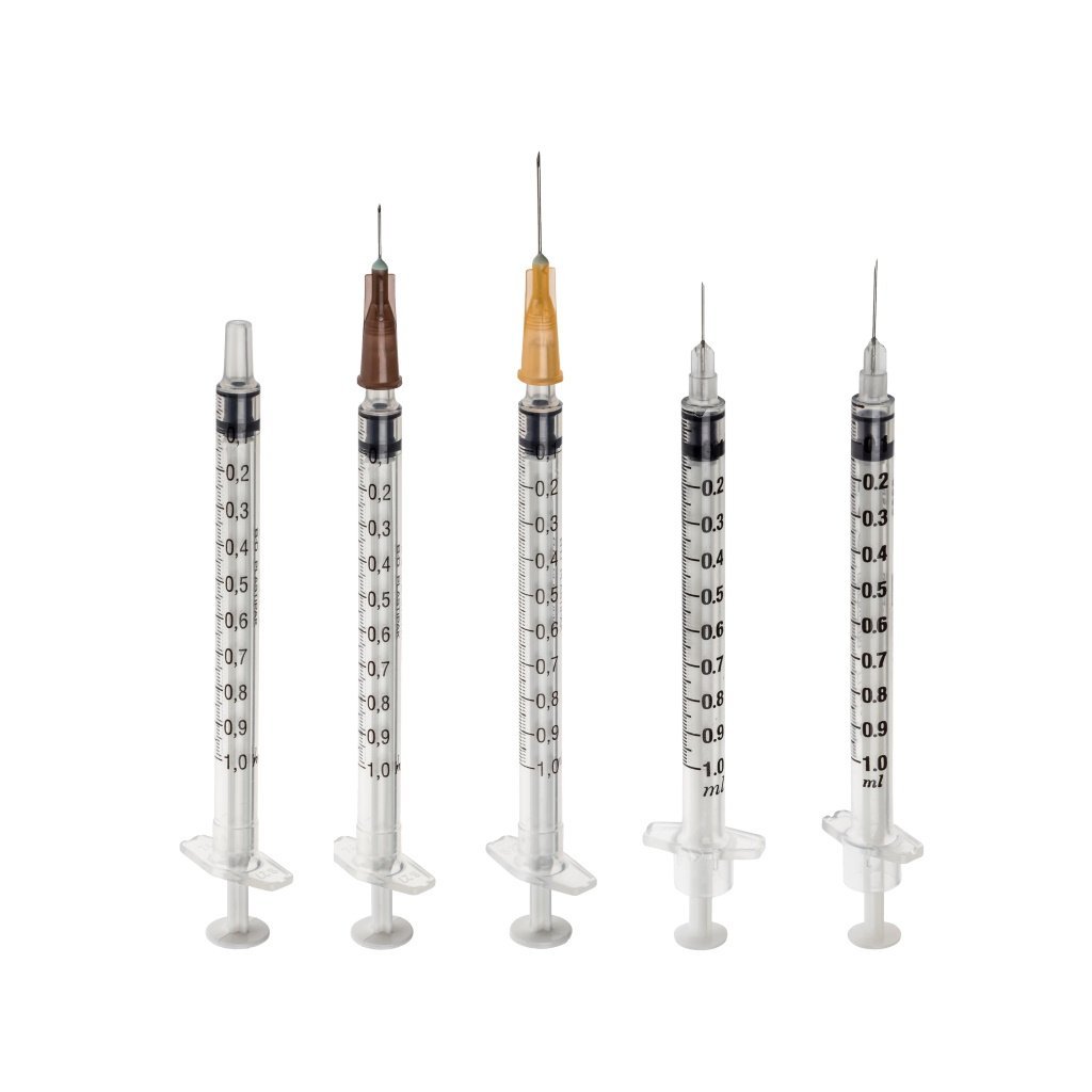 - 305501 - BD Plastipak™ „Sub-Q“ s integrovanou ihlou 26G (0.45×12.7), 100 ks v krab., vo vnútri balené v sáčku po 10 ks, sterilizované radiáciou. Každá striekačka má dve viečka - na ihle a na konci piestu a zostáva sterilná, až kým obe viečka nie sú buď odstránená alebo poškodená.