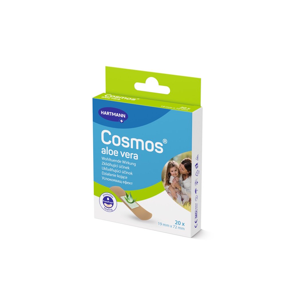 Cosmos náplasť s aloe vera, variant REF 500062 (19 x 72 mm) je zdravotnícky prostriedok určený na ošetrenie drobných rán, odrenín a popálenín. Obsahuje 1,5% výťažku aloe vera, ktorý upokojuje podráždenie, hydratuje ranu a podporuje jej hojenie. Vankúšik náplasti sa nelepí k rane, ale dobre absorbuje prebytočnú vlhkosť.