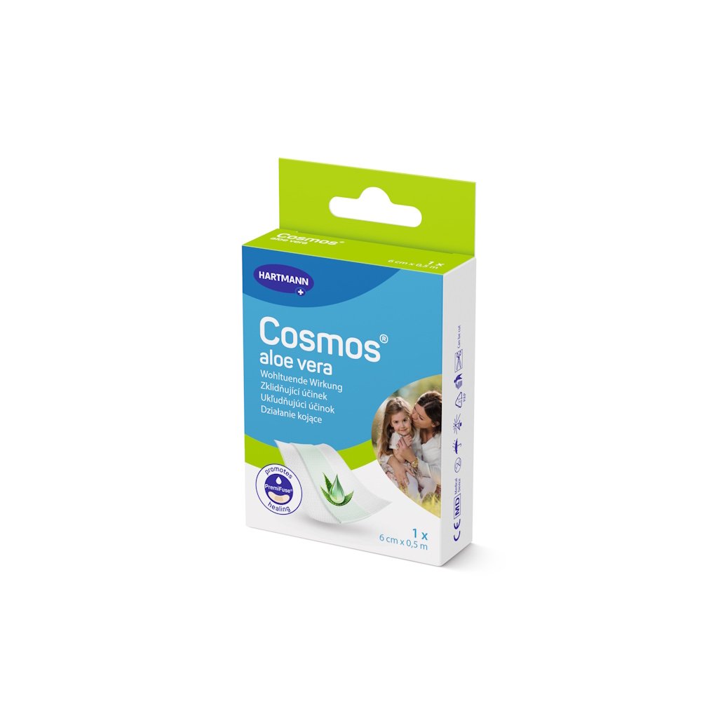 Cosmos náplasť s aloe vera vo variante 6 cm × 0,5 m (REF 500061) je univerzálna náplasť, ktorú je možné ľahko nastrihať na požadovanú dĺžku. Vďaka obsahu aloe vera má upokojujúci účinok na podráždenú pokožku, podporuje hydratáciu a prirodzenú regeneráciu kože a prispieva k rýchlejšiemu hojeniu drobných rán, odrenín či popálenín.