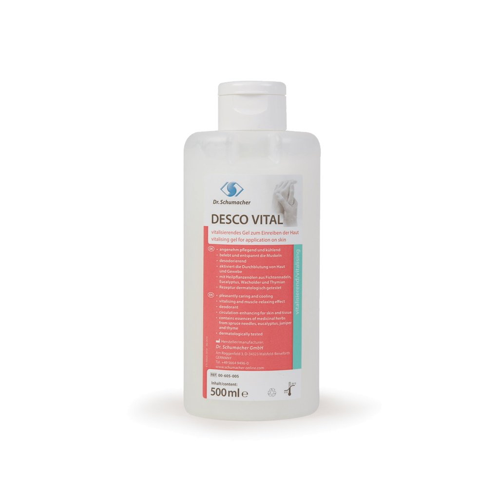 DESCO VITAL je hydrogél s vysoko kvalitnými éterickými olejmi zo smrekového ihličia, eukalyptu, plodov borievky a tymiánu, ktoré oživujú pokožku. DESCO VITAL má po namáhavom cvičení príjemné ochladzovacie, relaxačné a aktivačné účinky. Je ideálny pre použitie najmä pre športové a terapeutické masáže, rovnako ako pre ošetrovateľstvo, ale aj vo všetkých ostatných oblastiach, kde kde sa vyžaduje príjemný relaxačný a revitalizačný účinok. DESCO VITAL má príjemnú, sviežu vôňu a je dobre znášaný pokožkou, pretože je založený na čistom etanolu a má hydratačné vlastnosti.