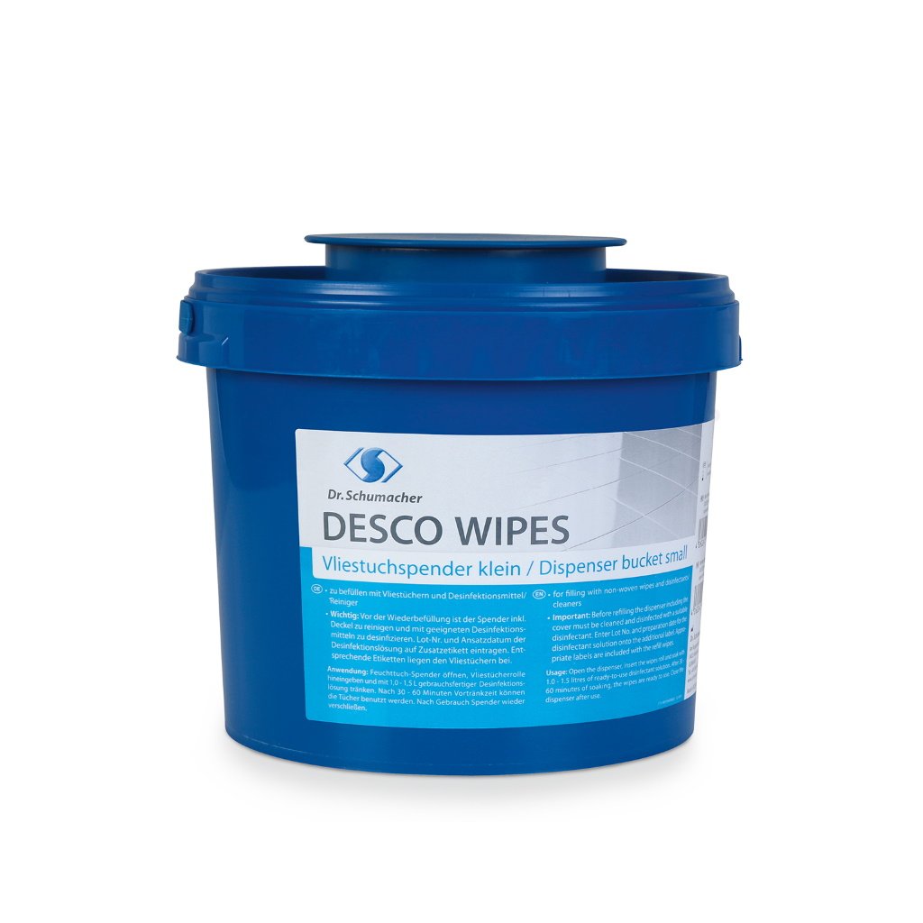 DESCO WIPES je opakovane použiteľný utěrkový systém pre dezinfekciu a čistenie zdravotníckych pomôcok a zdravotníckych zariadení všetkých typov. Skladá sa z opakovane použiteľného vedra pre dávkovanie netkaných utierok a zodpovedajúcich rolí netkaných utierok, ktoré možno stále dopĺňať. Môže byť použitý v kombinácii dezinfekčnými roztokmi pripravenými na okamžité použitie, ale aj užívateľsky riedenými koncentráty, čo je veľmi flexibilné.