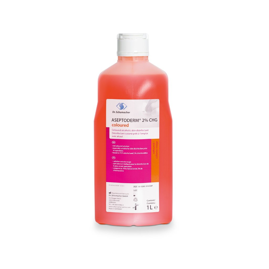Alkoholový dezinfekčný prostriedok na kožu, pripravený na okamžité použitie. ASEPTODERM 2% CHG coloured svojou červenou farbou označia oblasť, ktorá bola dezinfikovaná. Jeho primárnou použitie je v pred a pooperačné dezinfekcii kože. Naviac môže byť ASEPTODERM 2% CHG coloured použitý pred injekciami, rezy, punkciami, odbery krvi, zavedenie katétra, drobnými chirurgickými zákrokmi a menšími náhodnými úrazy. Šetrný k pokožke. Bez aldehydov, fenolov a KAS.