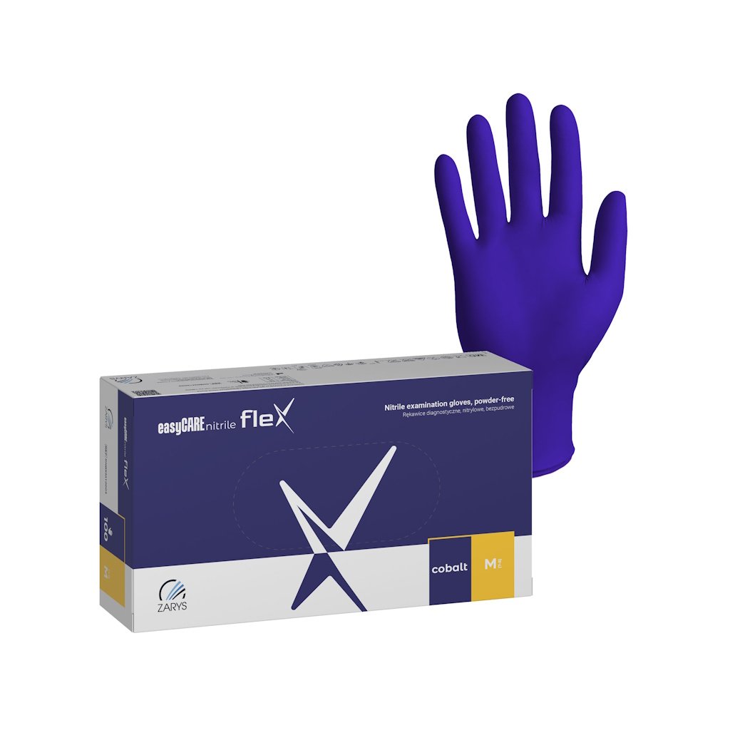 easyCARE FLEX nitrilové rukavice v kobaltovo modrej farbe sú zdravotnícka pomôcka (trieda I, MDR 2017/745) aj osobný ochranný prostriedok (kategória III, nariadenie EÚ 2016/425). Sú určené na vyšetrovacie a diagnostické úkony, chránia zdravotnícky personál i pacientov pred prenosom mikroorganizmov a minimalizujú riziko krížovej kontaminácie.