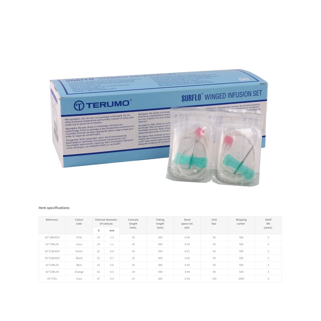 Okrídlené infúzne sety Surflo™ (= Scalp Vein alebo SV set) sú určené na zavedenie tekutín do cievneho systému po venepunkcii (jednorazové alebo krátkodobé intravenózne podanie). Zahŕňajú to najlepšie z technológie ihiel Terumo umožňujúce hladké prenikanie kožou.