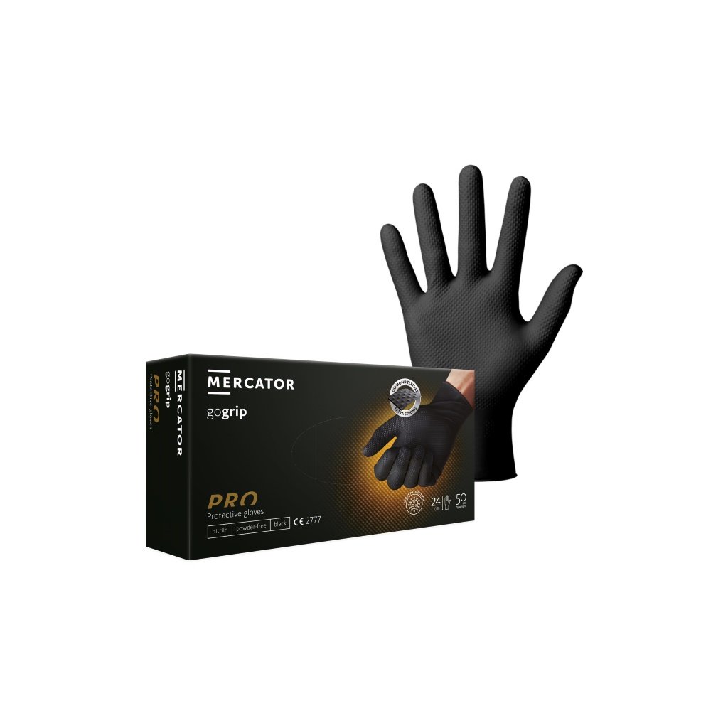 Nepúdrované nitrilové rukavice, ZOSILNENÉ, textúrované, čierne. Sú obojstranné (bez rozlíšenia pravej a ľavej ruky) a majú manžetu s rovnomerne rolovaným okrajom. Osobný ochranný prostriedok (OOP) triedy III. Vhodné pre styk s potravinami. Nejedná sa o zdravotnícky prostriedok (ZP).