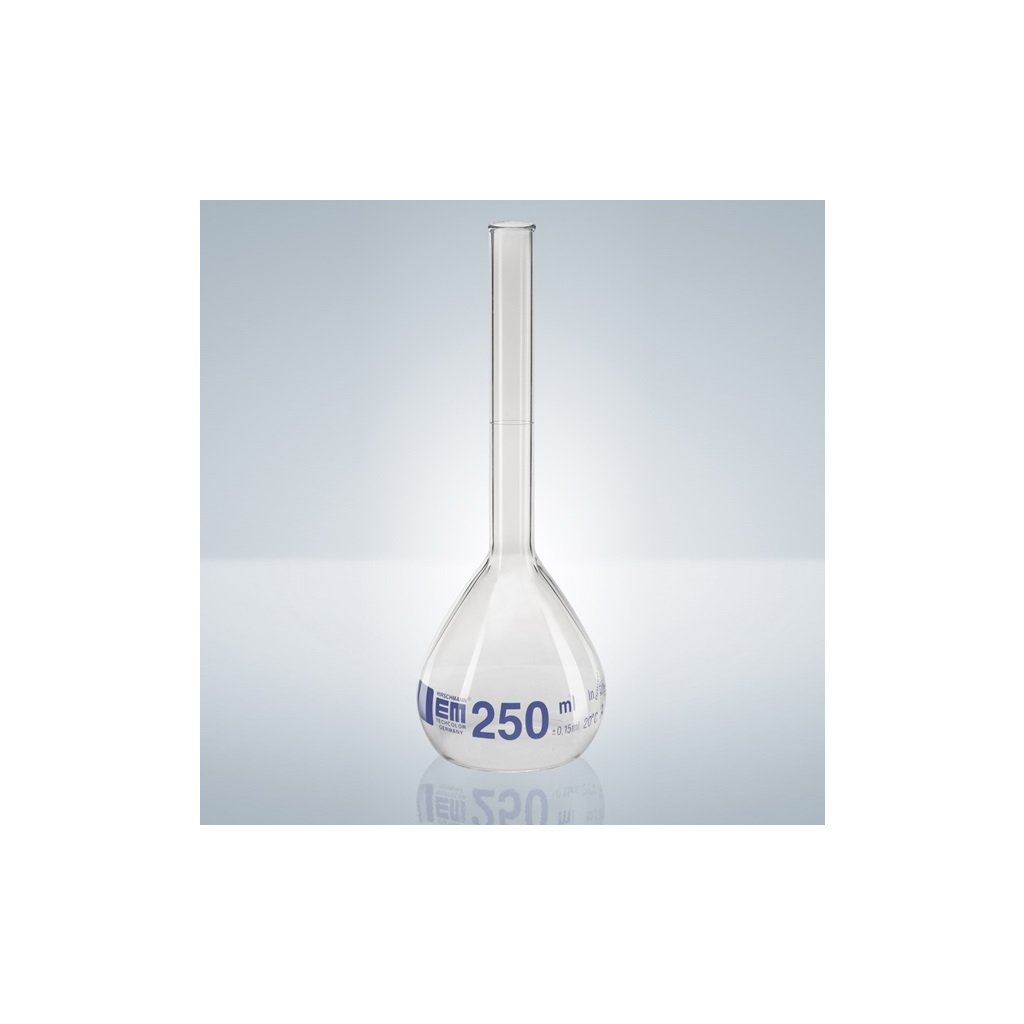 Odmerná banka s modrou tlačou a vyhrnutým okrajom, číre sklo, trieda A