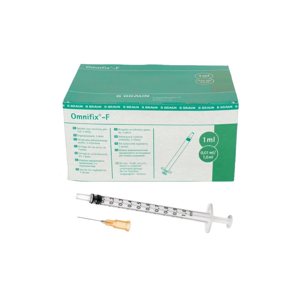 - OMNIFIX®-F DUO - 1 ml. Injekčná striekačka a ihla 25G (0.5×16, Jehla STERICAN, kód 4657853). Umiestnenie Luer konektoru: centrálne (uprostred valca)