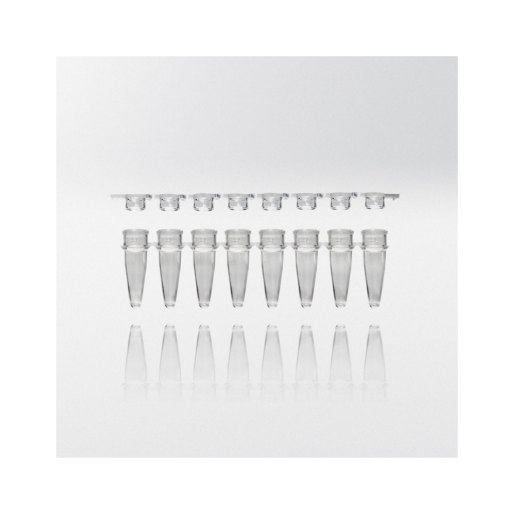 - Kompletné riešenie – 8-strip skúmaviek s už pripojenými plochými transparentnými viečkami.