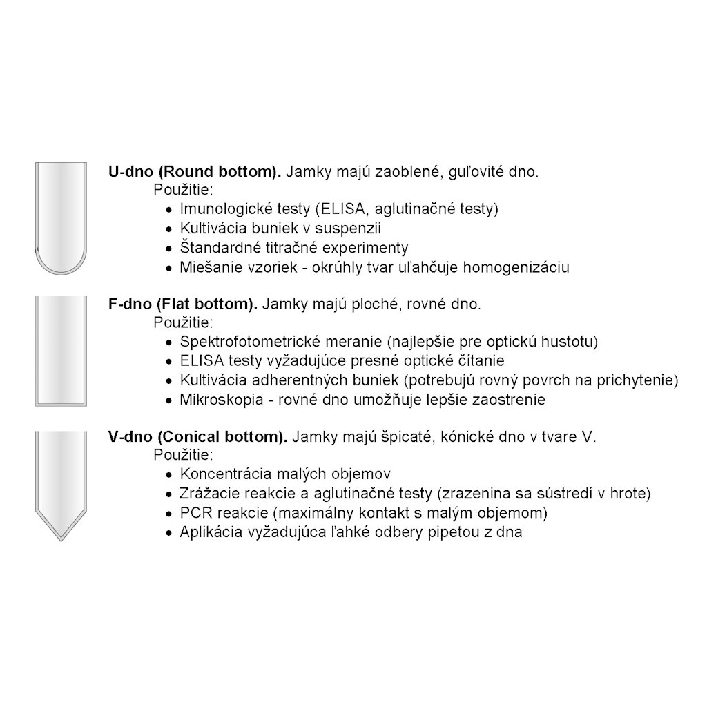 Mikrotitračné doštičky s 96 jamkami (8×12) vo viacerých variantoch. Použitý materiál je zvyčajne PS (polystyrén), ktorý má vhodné optické vlastnosti; pre něktré aplikácia môže byť vhodnejšie PP (polypropylén). Majú rôzny tvar dna, ktorý sa označuje písmenami: U: guľaté dno; V: špicaté dno; F: rovné dno. Pre lepšiu orientáciu majú jamky alfanumerické označenie.