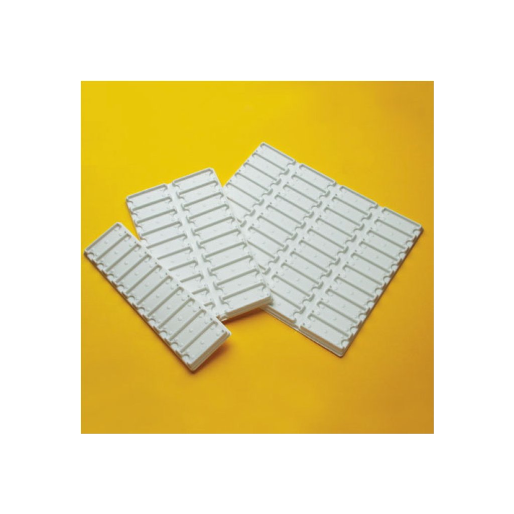 Tác pre mikroskopická skla položená naplocho. Sklíčka sa ľahko vkladajú a vynímajú; tácy možno pokladať na seba, čím sa chránia skla a zabraňuje sa ich pohybu.