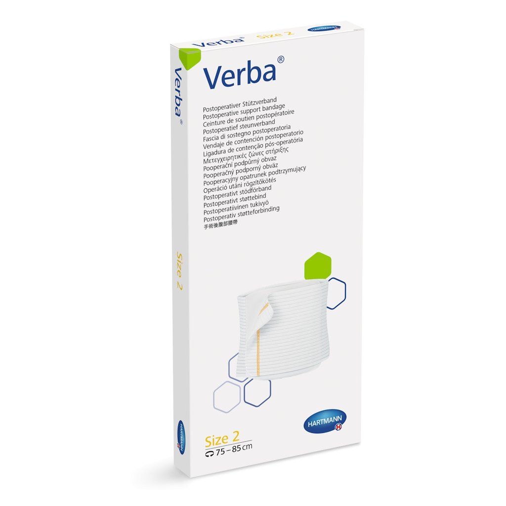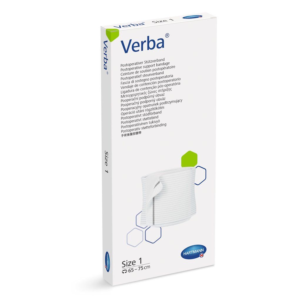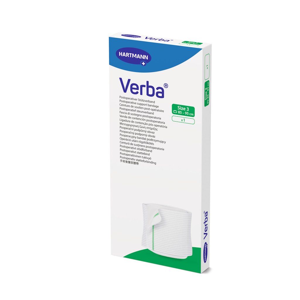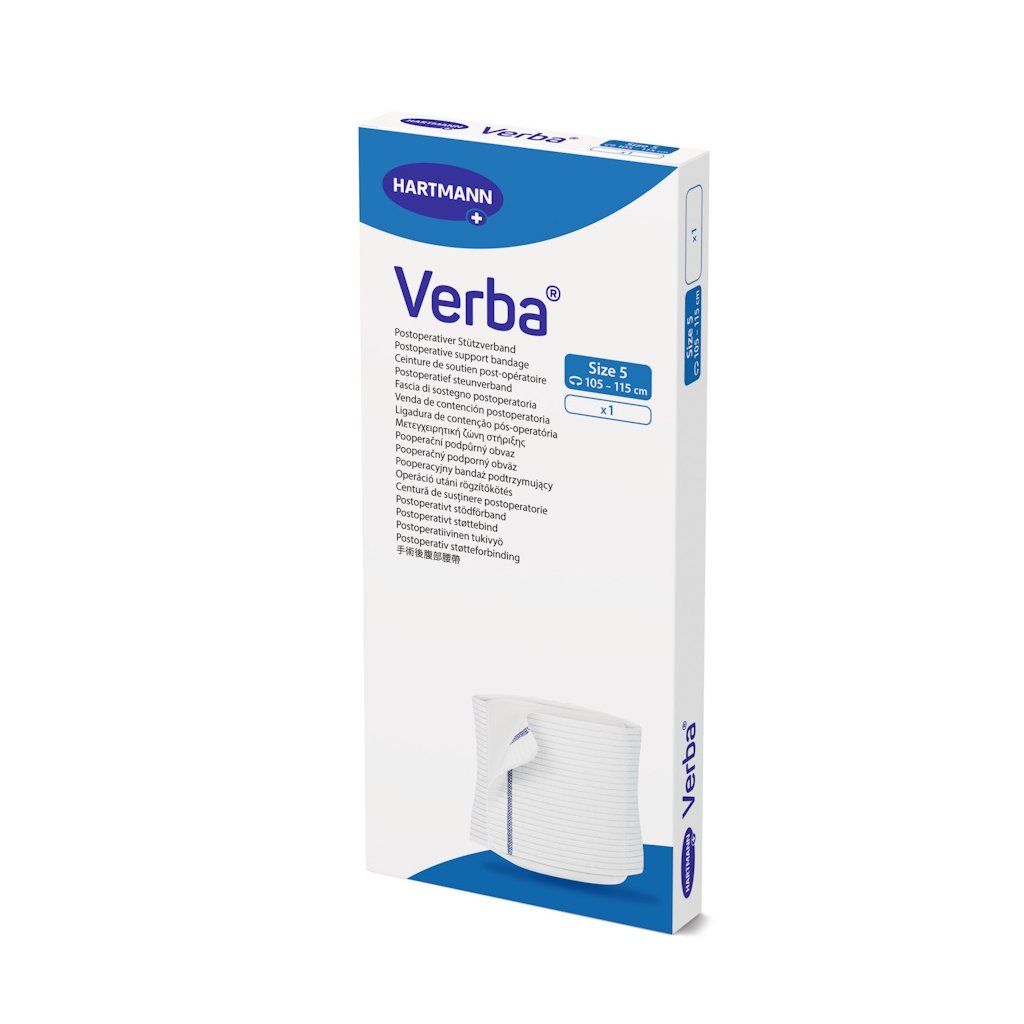 Pooperačný podporný obväz Verba® od výrobcu PAUL HARTMANN AG je elastický fixačný pás s plošným rozložením tlaku, určený na podporu a fixáciu oblasti hrudníka a brucha po operáciách, pri traumách aj v rámci rehabilitácie. Pozdĺžna elasticita v kombinácii s priečnou stabilitou zaručuje rovnomerné rozloženie tlaku po celej ploche pásu, pričom ani pri silnej kompresii nedochádza k obmedzeniu dychu pacienta. Zapínanie na suchý zips s nastaviteľnou rezervou až 10 cm umožňuje presné prispôsobenie individuálnemu tvaru tela a jednoduchú výmenu krytia rany bez nutnosti dávať dole celý pás. Pás je dostupný v piatich veľkostiach pre obvod trupu 65–115 cm.