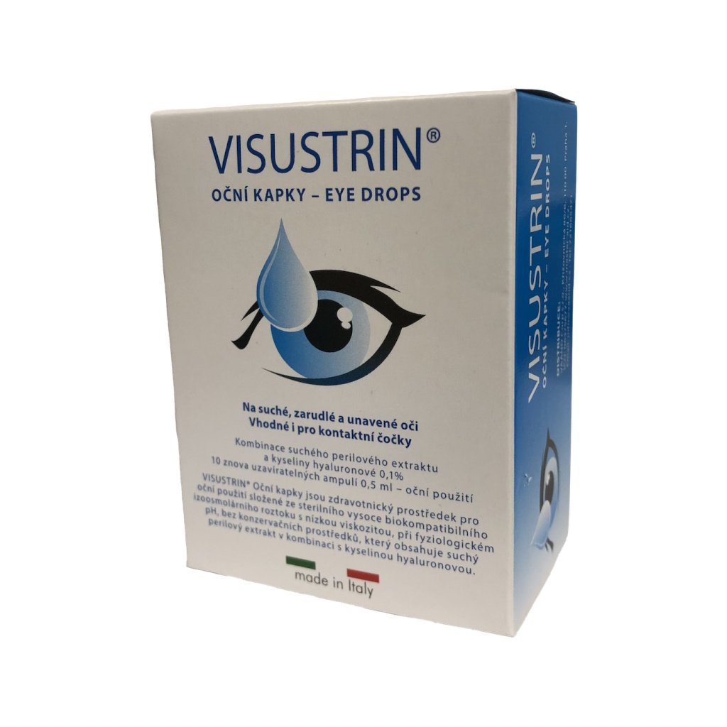 VISUSTRIN očné kvapky zmierňujú začervenanie očí, pomáhajú na suché a unavené oči spôsobené prachom a alergénmi, pri riadení, nadmernej svetelnej záťaži, pri použití kontaktných šošoviek, po účinku laserových operácii očí, pri liečebách šedého zákalu. Visustrin Očné kvapky, vďaka svojmu kvalitatívnemu/kvantitatívnemu zloženiu, majú antioxidačný, osviežujúci účinok.